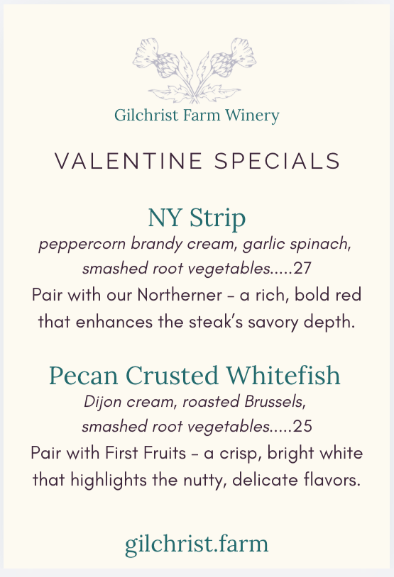 Join us at the farm for this special Valentine’s Day menu, available for lunch and dinner on Friday, February 13 and Saturday, February 14. Thoughtful food, award-winning wine, and a setting made for lingering — the perfect reason to plan something romantic. Reservations recommended but not required. Find details and plan ahead through the link below.