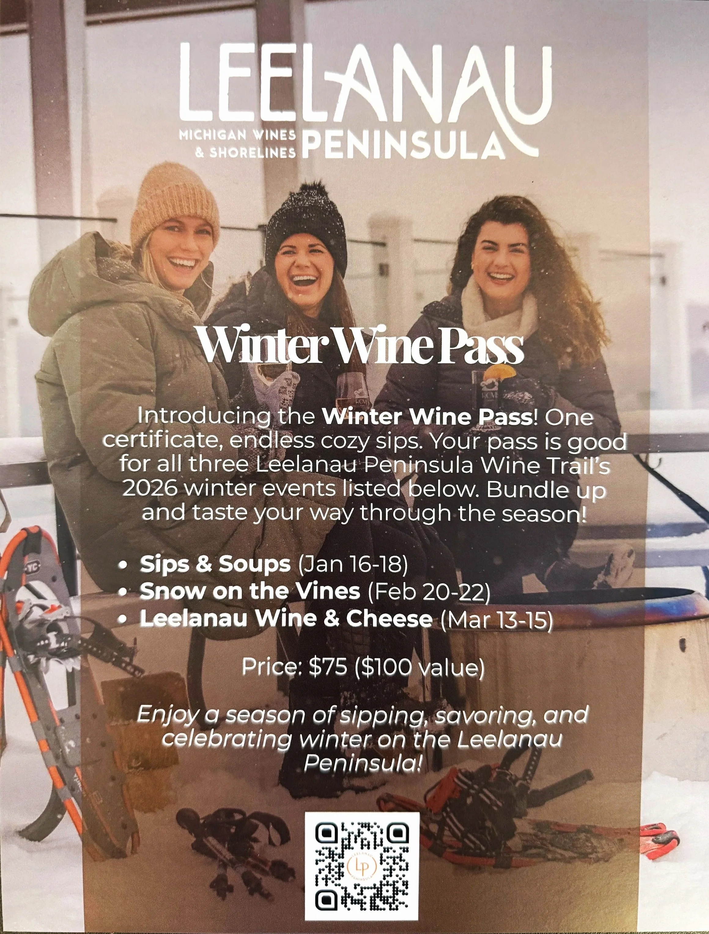 The Winter Wine Pass is your ticket to three Leelanau Peninsula Wine Trail favorites: Sips & Soups, Snow on the Vines, and Leelanau Wine & Cheese. Just $75 for a $100 value — the perfect holiday gift or stocking stuffer for wine lovers! Click here to purchase tickets: